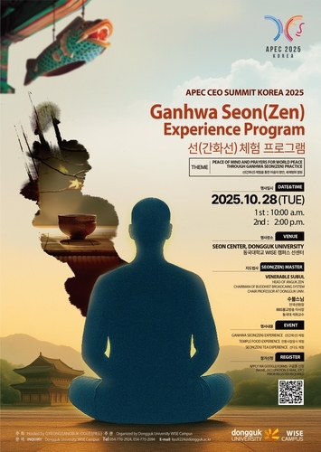 동국대, APEC 참가 CEO 대상 '선' 체험 행사 마련(기사발신지=연합뉴스) 손대성 기자 = 동국대 WISE(와이즈) 캠퍼스는 교내 선센터에서 아시아태평양경제협력체(APEC) 정상회의 참가국 최고경영자 및 관계자를 대상으로 선(간화선) 체험 행사를 한다고 18일 밝혔다. 체험행사는 오는 28일 오전 10시와 오후 2시