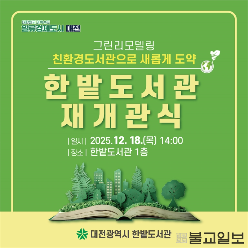 한밭도서관은 공공도서관 가운데 최대 규모로 추진된 그린리모델링을 완료하고, 친환경 독서문화공간으로 새롭게 단장해 18일 오후 2시 재개관 기념식을 개최한다. 이번 사업은 국토교통부와 국토안전관리원이 주관하는 국가 정책사업으로, 2030 국가 온실가스 감축목표 달성과 2050 탄소중립 이행을 위해 에너지 성능이 낮은 노후