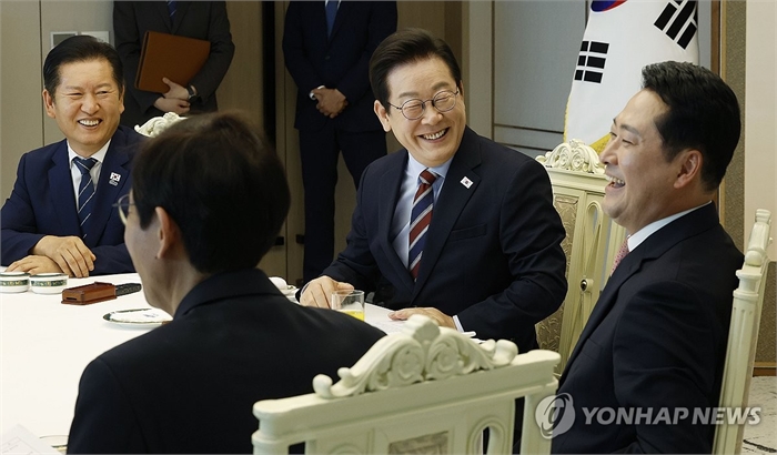 이재명 대통령, 여야 지도부 회동 (서울=연합뉴스) 한상균 기자 = 이재명 대통령이 8일 용산 대통령실에서 여야 지도부 오찬 회동을 하고 있다.