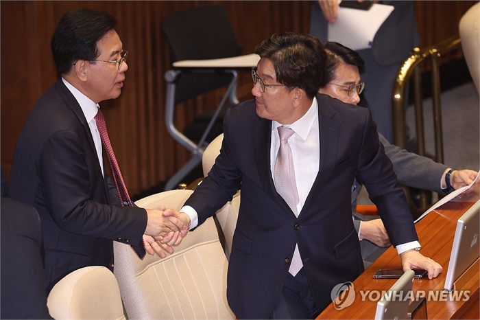 권성동 의원 체포동의안 본회의 보고 (서울=연합뉴스) 김주성 기자 = 불법 정치자금 수수 혐의로 구속 영장이 청구된 국민의힘 권성동 의원이 9일 자신의 체포동의안이 보고되는 국회 본회의에 출석해 송언석 원내대표와 악수하고 있다. 2025.9.9 utzza@yna.co.kr