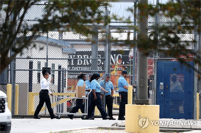 포크스턴 이민세관단속국 구금시설 (포크스턴[미국 조지아주]=연합뉴스) 윤동진 기자 = 9일(현지시간) 미국 당국의 이민단속으로 체포된 현대차-LG엔솔 배터리공장 건설 현장 직원들이 수감돼 있는 조지아주 포크스턴의 이민세관단속국(ICE) 구금시설 모습. 2025.9.10 mon@yna.co.kr