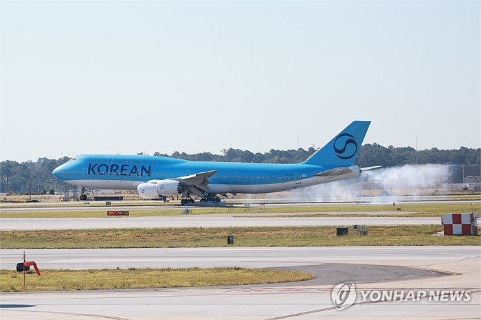애틀랜타 공항 도착하는 미국 구금 한국인 귀국편 전세기 (애틀랜타=연합뉴스) 신현우 기자 = 미국 조지아주 현대차그룹-LG에너지솔루션 배터리 합작 공장(HL-GA 배터리회사) 건설 현장에서 구금된 한국인을 태울 대한항공 전세기가 10일(현지시간) 하츠필드-잭슨 애틀랜타 국제공항에 착륙하고 있다.