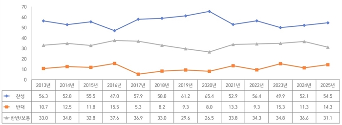 '반대한다'는 응답자는 14.3%, '반반/보통이다'는 31.1%로 집계됐다.