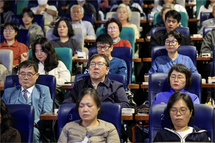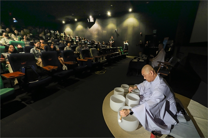 객석에 자리한 100여명은 싱잉볼의 파동을 몸으로 느끼며 차분하고 고요한 호흡을 반복했다. 10여분에 걸쳐 몸과 마음의 긴장을 풀고 나자 스크린에는 최신 영화 대신 녹음이 짙어가는 산사 풍경이나 좌선하는 스님들의 모습 등을 배경으로 명상을 유도하는 5분 선명상 안내 동영상인 '행복으로 가는 선명상'이 상영됐다.