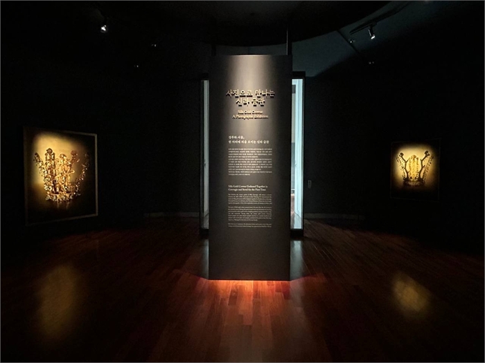 그동안 국보 '황남대총 북분 금관'과 '황남대총 북분 금제 허리띠'를 공개하던 전시실에 들어서면 총 5점의 금관 사진이 관람객을 맞는다.