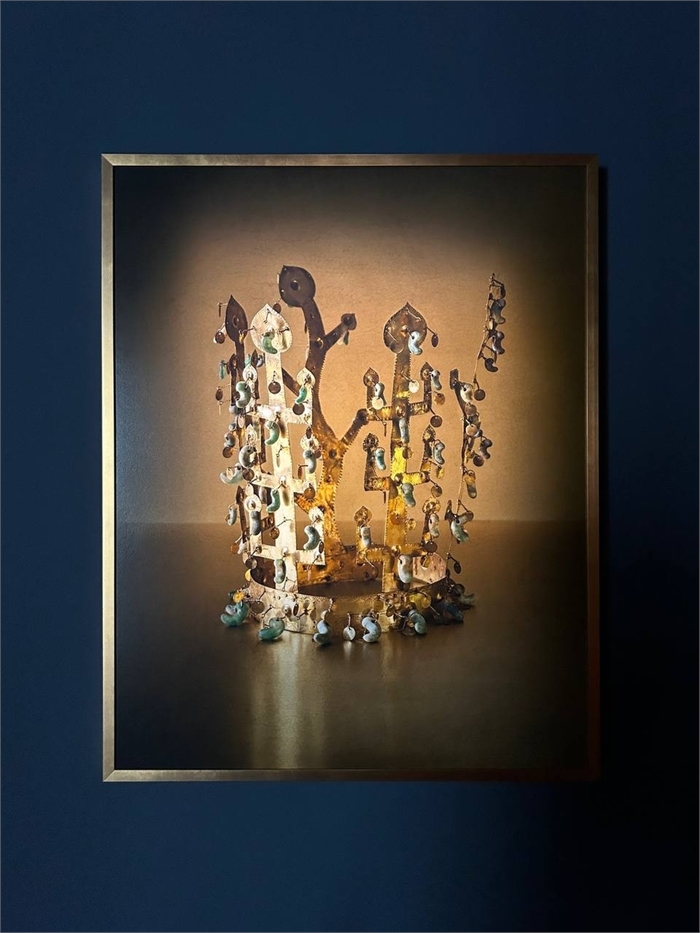 황금색을 배경으로 한 사진은 나뭇가지와 사슴뿔 모양의 장식, 푸른 빛의 곱은옥 등을 생생하게 느낄 수 있다.