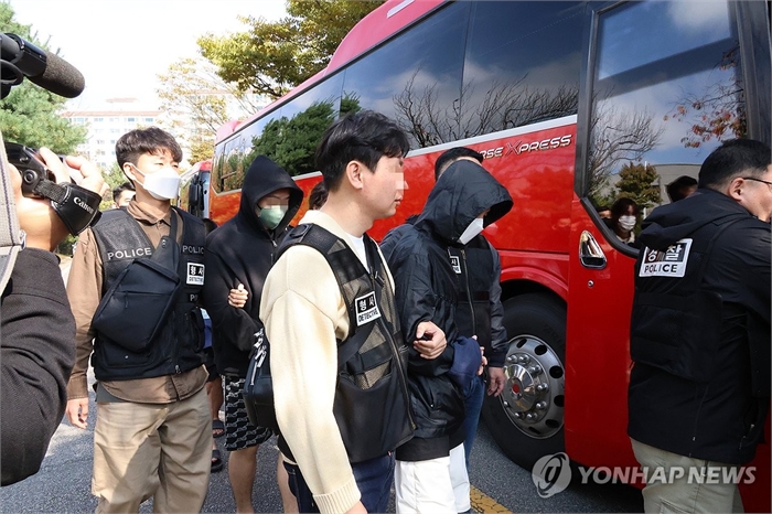 캄보디아에서 한국으로 송환된 한국인 구금자들 (영종도=연합뉴스) 김성민 기자 = 캄보디아 온라인 사기에 가담해 구금된 한국인들이 지난 18일 오전 인천국제공항 제2터미널을 통해 송환되고 있다. 이날 송환에는 경찰 호송조 190여명이 투입됐다. 2025.10.18 [공동취재] ksm7976@yna.co.kr
