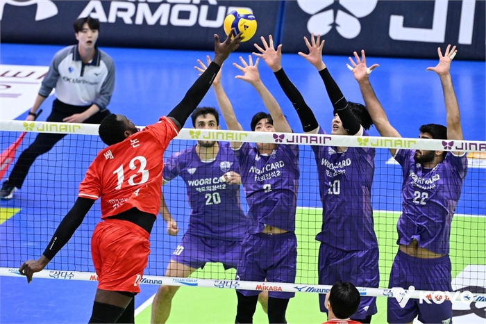 한국전력 베논의 공격을 차단하는 우리카드 블로커 [한국배구연맹 제공. 재판매 및 DB 금지]