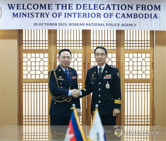 한국-캄보디아 경찰 양자회담 (서울=연합뉴스) 유재성 경찰청장 직무대행과 찌어 뻐우 캄보디아 경찰청 차장이 20일 서울 서대문구 경찰청에서 열린 양자회담에서 악수하고 있다. 2025.10.20 [경찰청 제공. 재판매 및 DB금지] photo@yna.co.kr