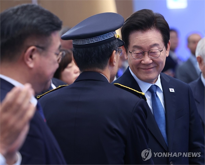 유재성 경찰청장 직무대행과 인사하는 이재명 대통령 (서울=연합뉴스) 김도훈 기자 = 이재명 대통령이 21일 서울 서대문구 경찰청에서 열린 80주년 경찰의 날 기념식이 끝난 뒤 유재성 경찰청장 직무대행과 인사하고 있다. 2025.10.21 superdoo82@yna.co.kr