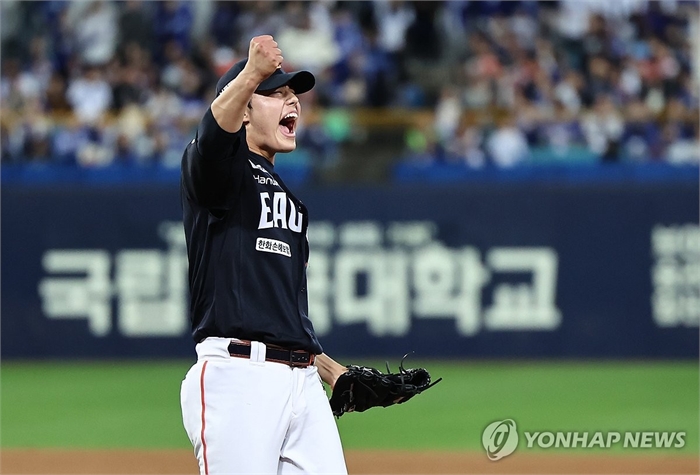 한화, 3차전 승리 (대구=연합뉴스) 윤동진 기자 = 21일 대구삼성라이온즈파크에서 열린 2025 KBO 포스트시즌 플레이오프 한화 이글스 대 삼성 라이온즈 3차전. 5 대 4로 경기를 마친 후 한화 투수 문동주가 기뻐하고 있다. 2025.10.21 mon@yna.co.kr