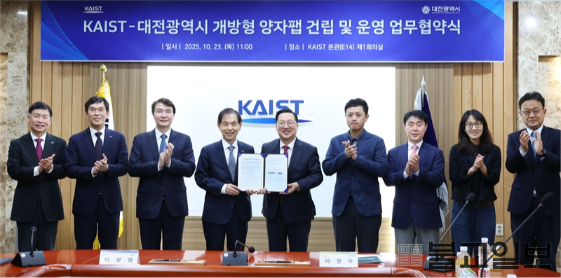 시는 23일 KAIST 본원에서 이장우 대전시장과 이광형 KAIST 총장이 참석한 가운데 ‘개방형 양자팹 구축 및 운영을 위한 업무협약’을 체결하고, 국가 핵심 양자 인프라 조성의 첫발을 내디뎠다.