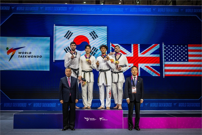 강상현은 24일 중국 장쑤성 우시의 타이후 인터내셔널 엑스포 센터서 열린 2025 세계태권도선수권대회 첫날 남자 87㎏초과급 결승에서 개인중립선수(AIN)로 출전한 라파일 아이유카에프를 라운드 점수 2-1로 꺾고 금메달을 목에 걸었다.