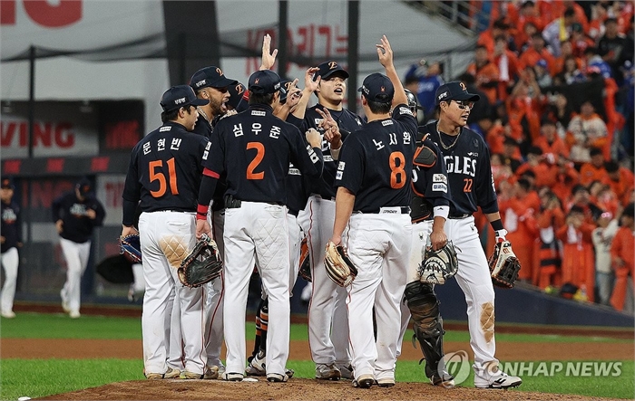 한화, 프로야구 플레이오프 3차전 승리 (대구=연합뉴스) 윤관식 기자 = 21일 대구 삼성라이온즈파크에서 열린 2025 프로야구 KBO리그 포스트시즌 플레이오프 3차전 한화 이글스와 삼성 라이온즈의 경기. 한화 선수들이 승리 후 환호하고 있다. 2025.10.21 psik@yna.co.kr
