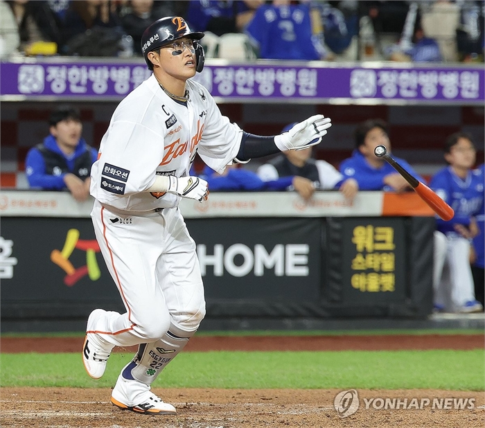 3회말 1사 1, 3루 상황에서 한화 채은성이 적시타를 친 뒤 타구를 바라보고 있다. 2025.10.24 ondol@yna.co.kr