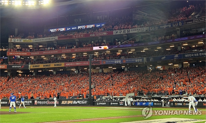 가을 야구 즐기는 관중 (대전=연합뉴스) 김준범 기자 = 24일 대전 한화생명 볼파크에서 열린 2025 프로야구 KBO리그 포스트시즌 플레이오프 5차전 삼성 라이온즈와 한화 이글스의 경기. 1루석 관중들이 힘차게 한화를 응원하고 있다. 2025.10.24 psykims@yna.co.kr