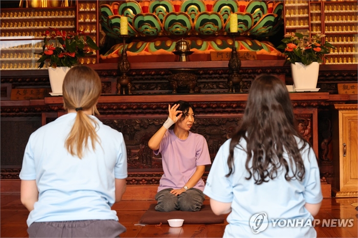 템플스테이 체험하는 외국인 관광객 (김제=연합뉴스) 백승렬 기자 = 지난 9월 8일 김제 금산사에서 템플스테이 체험하는 외국인 관광객. 2025.10.25. srbaek@yna.co.kr