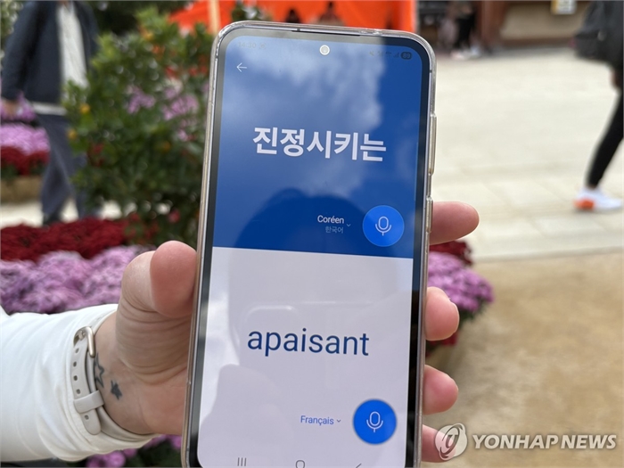 프랑스인 베로니크(46) 씨는 "아름답고 공기도 맑다"며 미소 지었다. 사찰에 오니 어떠냐고 묻자 그는 번역기 화면에 'apaisant(진정시키는)'라는 단어를 띄워 보여줬다.