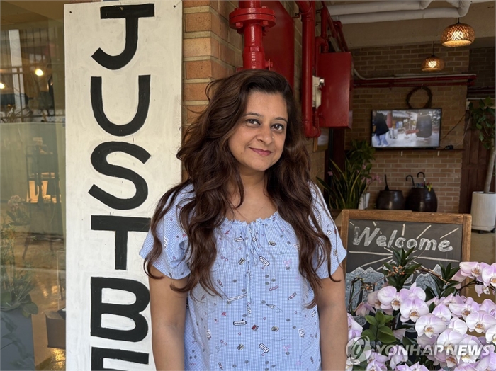 "만족스러워요" 소감 전하는 앤첼라 씨 (서울=연합뉴스) 최혜정 인턴기자 = 지난 23일 서대문구 템플스테이 숙소 '홍대선원'에 묵고 있는 앤첼라 씨가 숙소 간판 옆에서 포즈를 취하고 있다. 2025.10.25
