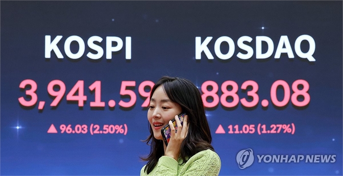 이날 코스피는 전 거래일보다 96.03p(2.50%) 오른 3,941.59로 마감했다. 코스닥 지수는 11.05포인트(1.27%) 상승한 883.08로 거래를 마쳤다. 2025.10.24 nowwego@yna.co.kr