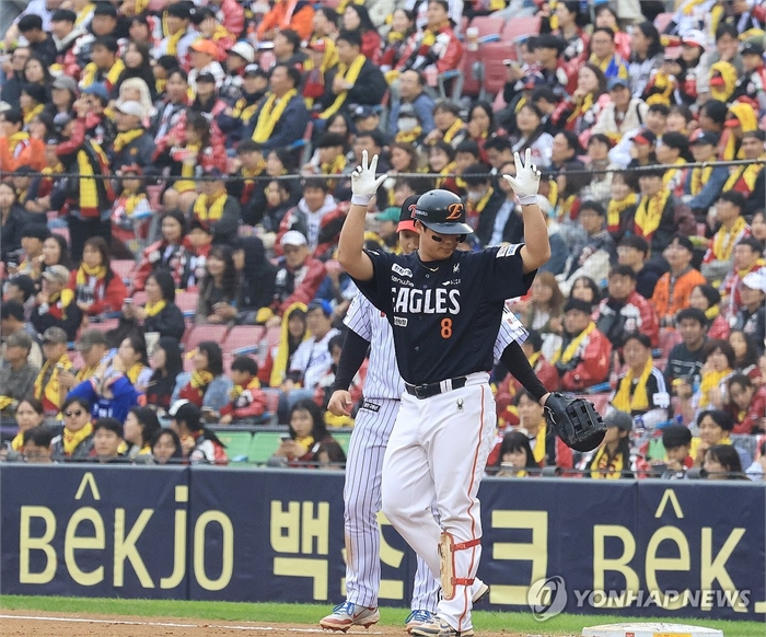 환호하는 노시환 (서울=연합뉴스) 최재구 기자 = 26일 서울 잠실야구장에서 열린 2025 프로야구 KBO리그 포스트시즌 한국시리즈 1차전 한화 이글스와 LG 트윈스의 경기. 6회말 1사 3루 한화 노시환이 1타점 적시타를 치고 기뻐하고 있다. 2025.10.26 jjaeck9@yna.co.kr