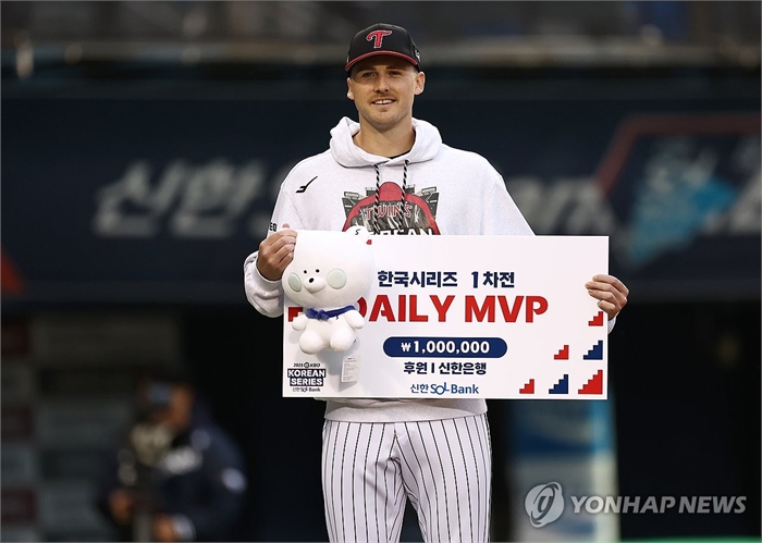 톨허스트, 한국시리즈 1차전 MVP (서울=연합뉴스) 윤동진 기자 = 26일 서울 잠실야구장에서 열린 2025 프로야구 한국시리즈 한화 이글스 대 LG 트윈스 1차전 경기. 8 대 2 LG의 승리로 경기가 끝난 후 경기 MVP로 선정된 LG 선발투수 톨허스트가 기념 촬영을 하고 있다. 2025.10.26 mon@yna.co.kr