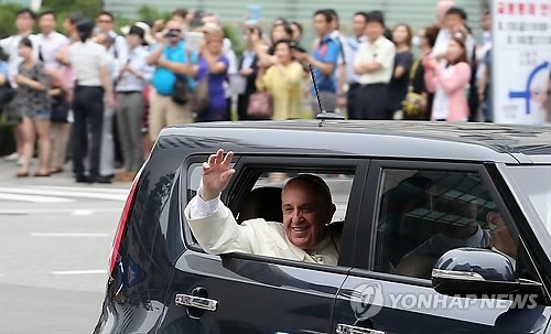 손 흔드는 프란치스코 교황(2014년) (서울=연합뉴스) 프란치스코 교황이 2014년 8월 14일 오전 서울공항을 통해 입국해 궁정동 교황청대사관으로 향하며 을지로입구역 부근의 시민들에게 손을 들어 인사하고 있다. [자료사진]