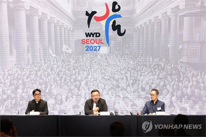 2027 서울 세계청년대회 언론브리핑 (서울=연합뉴스) 강민지 기자 = '2027 서울세계청년대회' 총괄코디네이터인 이경상 주교(가운데)가 27일 서울 서초구 가톨릭대 옴니버스파크에서 열린 '2027 서울 세계청년대회 기본계획 언론브리핑'에서 질의응답하고 있다. 2025.10.27 mjkang@yna.co.kr
