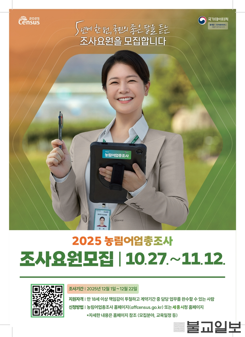 세종특별자치시(시장 최민호)가 오는 11월 12일까지 ‘2025 농림어업총조사’ 현장조사 업무를 담당할 조사원 107명을 모집한다.