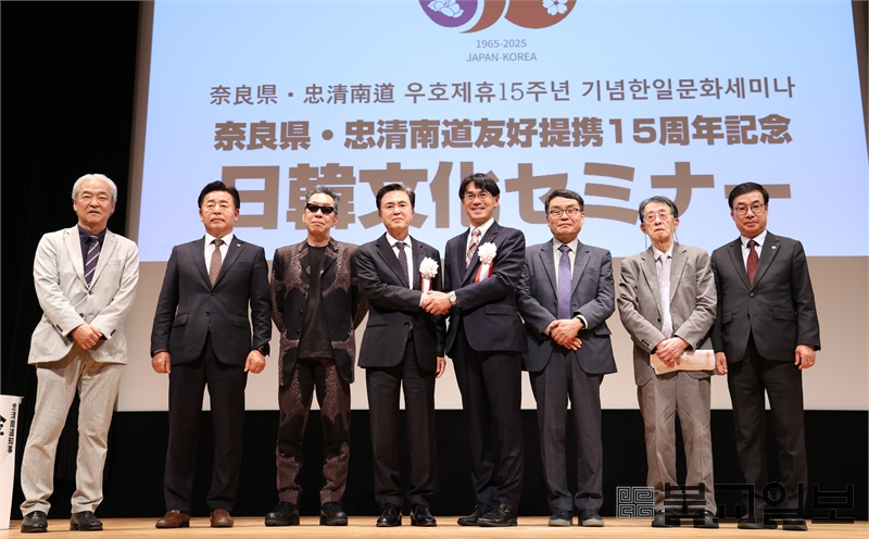 충남도와 나라현이 공동 주최하고 충남역사문화연구원이 주관한 ‘한일문화 세미나’가 25일 일본 가시하라시 만요홀에서 열렸다. 이번 행사는 충남-나라현 우호협력 15주년을 기념해 마련된 자리로, 김태흠 충남도지사와 야마시타 마코토 나라현 지사, 학계 및 문화계 인사 등 500여 명이 참석했다.