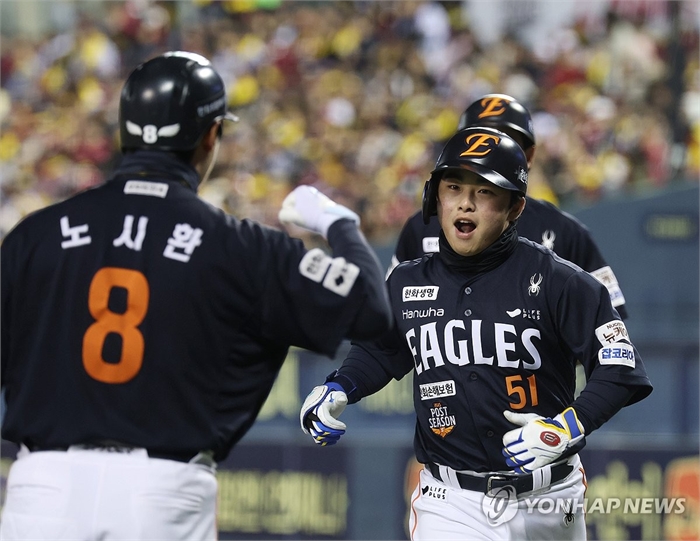 이어 타석에 나선 노시환은 임찬규의 시속 143㎞ 직구를 때려 가운데 펜스를 넘어가는 백투백 홈런으로 3-0을 만들었다.