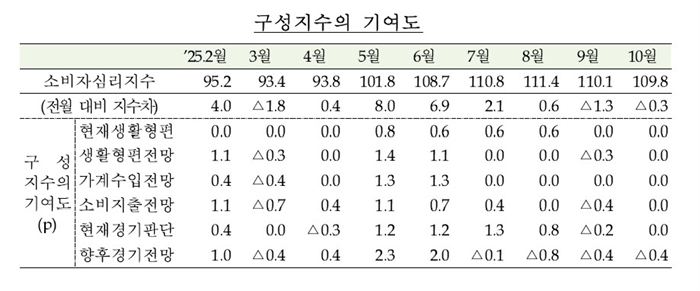 10월 소비자심리지수(CCSI)는 109.8로 9월(110.1)보다 0.3p 내렸다. 한미 무역 협상 장기화, 미·중 무역 갈등 재부각 등 영향이다.