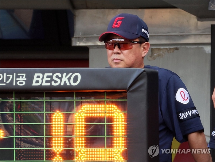 경기 지켜보는 김경문 감독 (서울=연합뉴스) 윤동진 기자 = 27일 서울 잠실야구장에서 열린 2025 프로야구 한국시리즈 한화 이글스 대 LG 트윈스 2차전. 7회 초 김경문 한화 이글스 감독(왼쪽)이 경기를 지켜보고 있다. 2025.10.27 mon@yna.co.kr