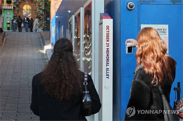 기억과 안전의 길 살펴보는 외국인들 (서울=연합뉴스) 서대연 기자 = 10.29 이태원 참사 3주기를 하루 앞둔 28일 서울 용산구 이태원역 1번 출구 인근 참사 현장에 마련된 '10.29 기억과 안전의 길' 앞에서 외국인들이 현장을 살펴보고 있다. 2025.10.28 dwise@yna.co.kr