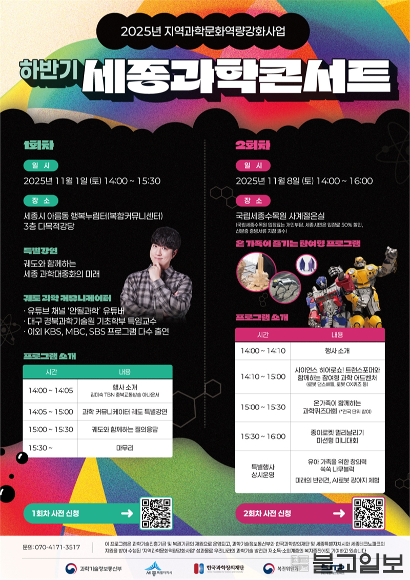 11월 1일에는 아름동 행복누림터에서 과학 커뮤니케이터 궤도(유튜브 ‘안될과학’)가 ‘세종 과학대중화의 미래’를 주제로 강연을 진행한다. 이번 강의에서는 과학문화 확산의 필요성과 과학소통의 중요성, 그리고 과학이 일상과 사회에 미치는 영향 등을 시민과 함께 탐구하는 시간을 가진다.