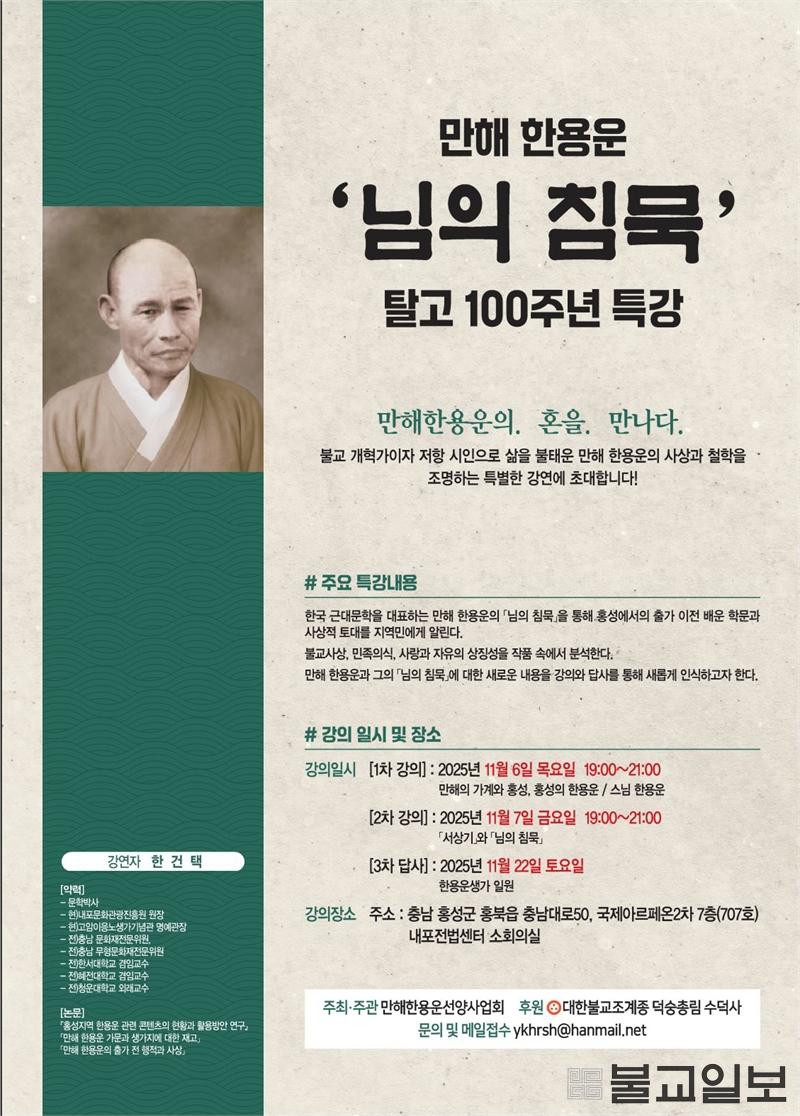 이번 강좌는 만해의 「님의 침묵」을 통해 한국 근대문학의 정신적 뿌리를 되짚고, 민족문화·불교사상·자유철학을 종합적으로 고찰하는 인문학적 의미를 더한다.