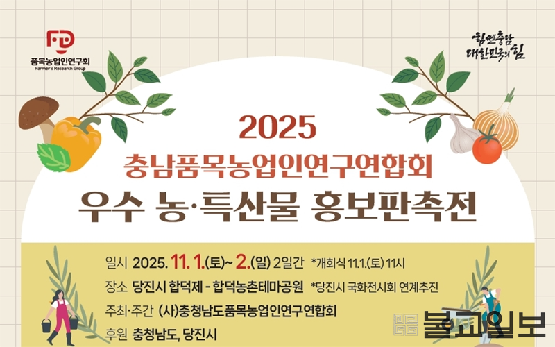 충청남도농업기술원은 다음달 1일부터 2일까지 당진시 합덕농촌테마공원에서 ‘충남 우수 농·특산물 홍보판촉전’을 개최한다고 29일 밝혔다.