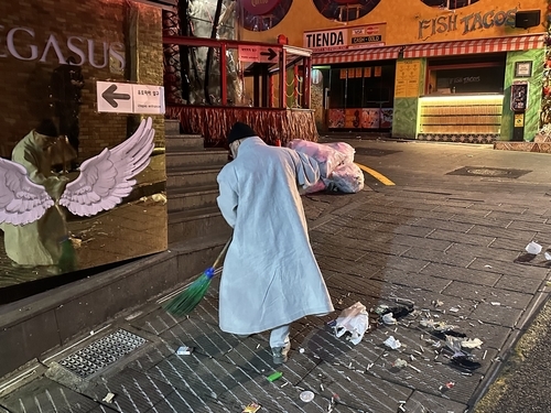 이태원 참사 3주기인 29일 새벽 이태원 거리 청소에 나선 스님 [촬영 조윤희 수습기자]