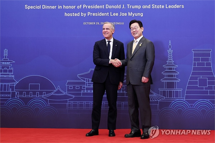 캐나다 총리 영접하는 이재명 대통령 (경주=연합뉴스) 김도훈 기자 = 이재명 대통령이 29일 경북 경주 힐튼호텔 그랜드볼룸에서 열린 대통령 주최 정상 특별만찬에 앞서 마크 카니 캐나다 총리를 영접하고 있다. 2025.10.29 superdoo82@yna.co.kr