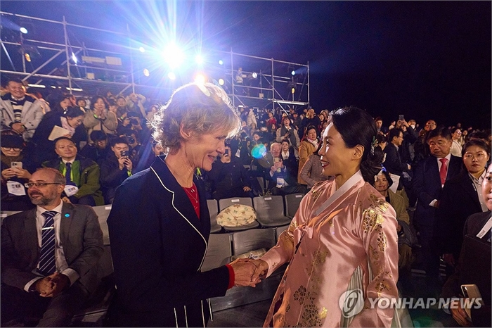 한복패션쇼 참석한 김혜경 여사 (경주=연합뉴스) 김혜경 여사가 29일 경북 경주시 월정교 특설무대에서 열린 2025년 APEC 정상회의 한복 패션쇼에서 마크 카니 캐나다 총리의 부인 다이애나 폭스 카니 여사와 인사하고 있다. 2025.10.29 [대통령실 제공. 재판매 및 DB 금지] photo@yna.co.kr