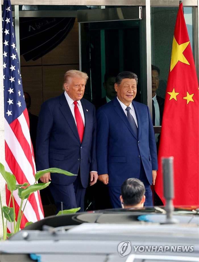 미중 정상회담 종료 (부산=연합뉴스) 손형주 기자 = 도널드 트럼프 미국 대통령과 시진핑 중국 국가주석이 30일 부산 김해공군기지 의전실 나래마루에서 미중 정상회담을 마친 뒤 회담장을 나서고 있다. 2025.10.30 handbrother@yna.co.kr