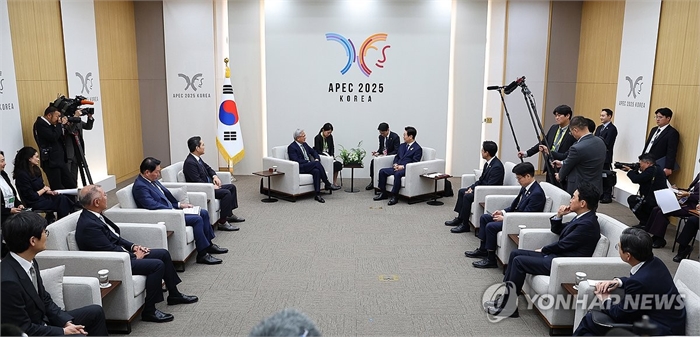 이재명 대통령, 젠슨 황 접견 (경주=연합뉴스) 김도훈 기자 = 이재명 대통령이 31일 APEC 정상회의장인 경주화백컨벤션센터에서 젠슨 황 엔비디아 최고경영자를 접견하고 있다.