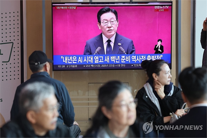 이재명 대통령 시정연설 지켜보는 시민들 (서울=연합뉴스) 서대연 기자 = 4일 서울역 대합실에서 시민들이 이재명 대통령의 내년도 정부 예산안 관련 시정연설 방송 중계를 지켜보고 있다. 2025.11.4 dwise@yna.co.kr
