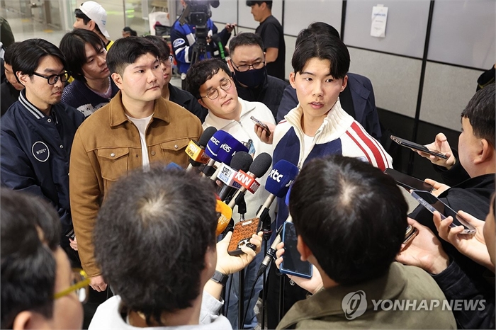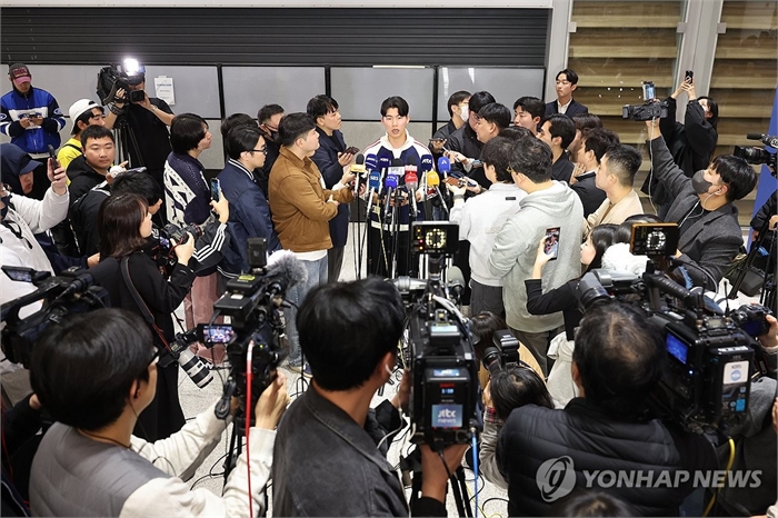 취재진 질문에 답하는 김혜성 (영종도=연합뉴스) 임화영 기자 = 미국프로야구 메이저리그(MLB) 월드시리즈에서 우승한 로스앤젤레스 다저스의 김혜성이 6일 인천국제공항을 통해 귀국해 취재진의 질문에 답하고 있다. 2025.11.6 hwayoung7@yna.co.kr