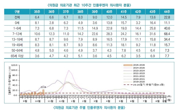 7일 질병관리청의 의원급 인플루엔자 환자 표본감시 결과에 따르면 올해 44주차인 지난 일주일간(10월 26일∼11월 1일) 전국 300개 표본감시 의원을 찾은 독감 증상 환자는 외래환자 1천 명당 22.8명이었다.