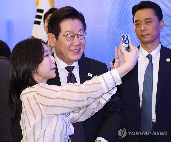 참석자와 셀피 사진 찍는 이재명 대통령 (서울=연합뉴스) 한상균 기자 = 이재명 대통령이 10일 서울 마포구 프론트원에서 열린 국민성장펀드 보고대회가 끝난 뒤 참석자 요청에 함께 셀피 사진을 찍고 있다. 2025.9.10 xyz@yna.co.kr
