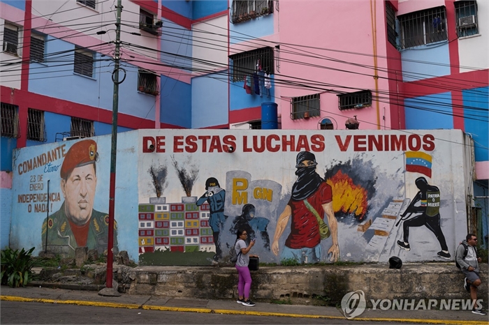 11일(현지시간) 베네수엘라 좌파 지도자 우고 차베스 벽화(왼쪽)와 투쟁 의지를 고취하는 글귀 [카라카스 AP=연합뉴스. 재판매 및 DB 금지]