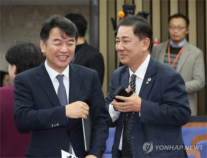 미소짓는 김병기-문진석 (서울=연합뉴스) 박동주 기자 = 더불어민주당 김병기 원내대표와 문진석 원내수석부대표가 13일 서울 여의도 국회에서 열린 의원총회에 참석하고 있다. 2025.11.13 pdj6635@yna.co.kr