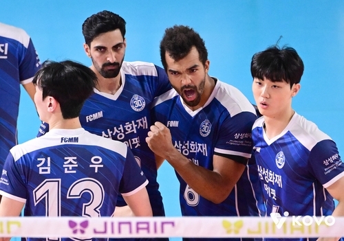 득점 후 기뻐하는 삼성화재 선수들 [한국배구연맹 제공. 재판매 및 DB 금지]