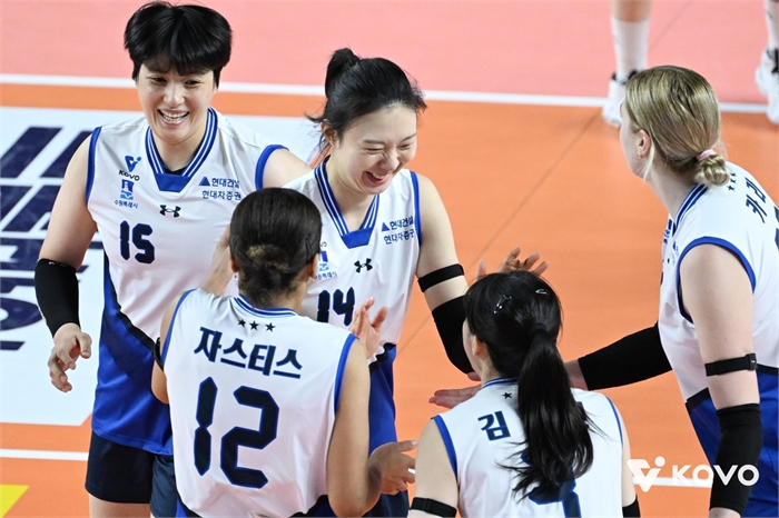 득점 후 기뻐하는 현대건설 선수들 [한국배구연맹 제공. 재판매 및 DB 금지]